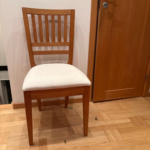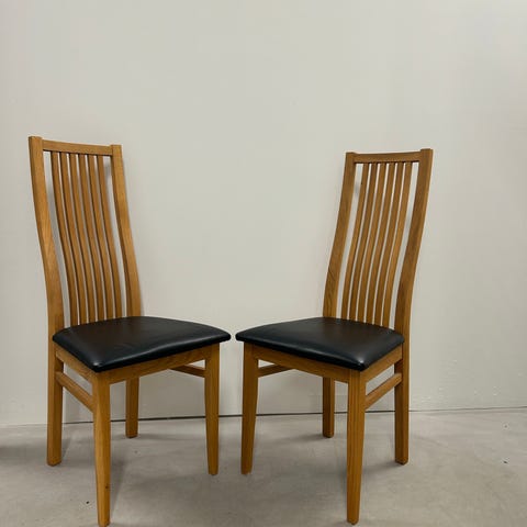 Stadig, tung, stol i massiv ek. Bredden ca 63 cm avser längst fram på bredaste stället. Lägg i en sittdyna och använd som skön kontorsstol.