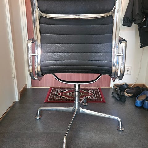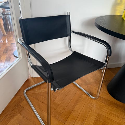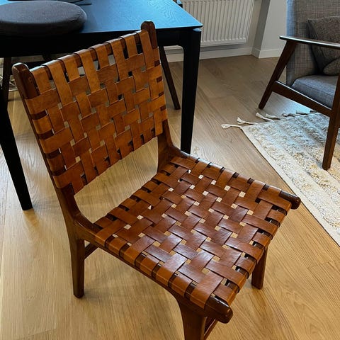 Jakaranda. Sitsar och armlän i svart läder. Där sitsen är smord o torkat in bra .skinnet sittdyna med knapphäftning.