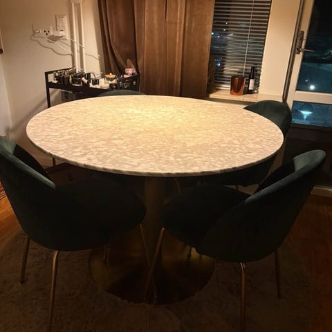 Bord med stenskiva av marmor och fot i metall med nyans av mässing/guld.
