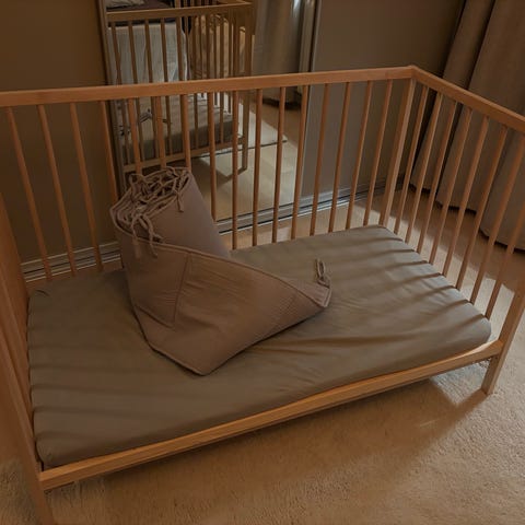 Beiget spjälsängsslydd på bild 1 ingår ej i priset. Säljs separat.