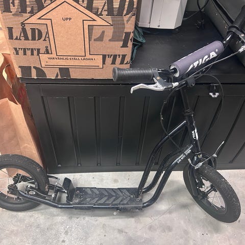 KickScooter för barn med svart och blå färg. Har justerbart styre i höjd och handtag med greppvänligt material. Någon rost finns på sparken.