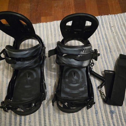 Snowboardbindningar från Flow modell Flite. Ett spänne trasigt på höger sida.