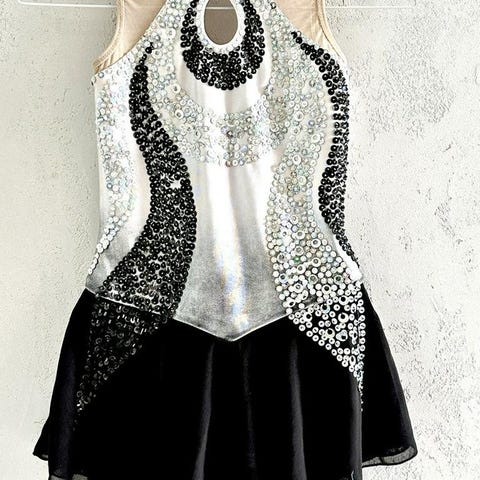 Blå kristallprydd klänning. Liv med hög hals som knäpps med dragkedja i Lycra.