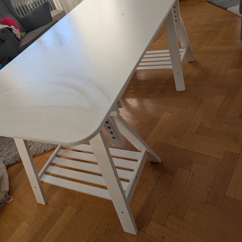 Säljer nu ett par (2 stycken) MITTBACK benbockar från IKEA i färgen björk. De är i mycket gott skick och fungerar perfekt för att bygga ett stabilt skrivbord eller arbetsbord.