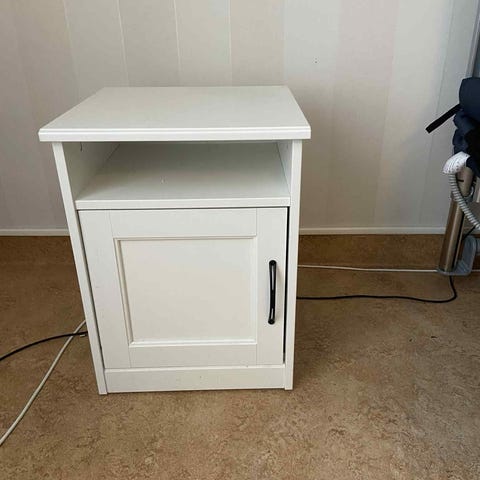 Vit nattduksbord med skåp och hylla
