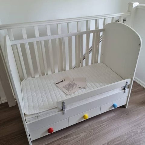 IKEA Spjälsäng barnmöbel i vit färg. Tillverkad i trämaterial, avsedd för barn. Passar som spjälsäng för små barn. Använd till ett barn, knappt använd