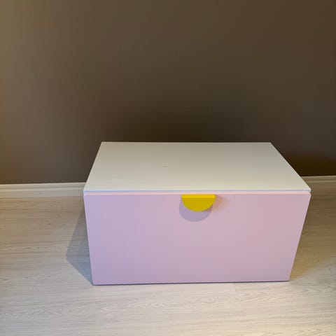 IKEA barnmöbel förvaring med flera plastlådor i olika färger (grön, gul, svart, rosa, orange). Möbeln är i vitt och har mindre skador på ytan enligt bilder. Passar för organisering och förvaring av leksaker eller barnens saker.