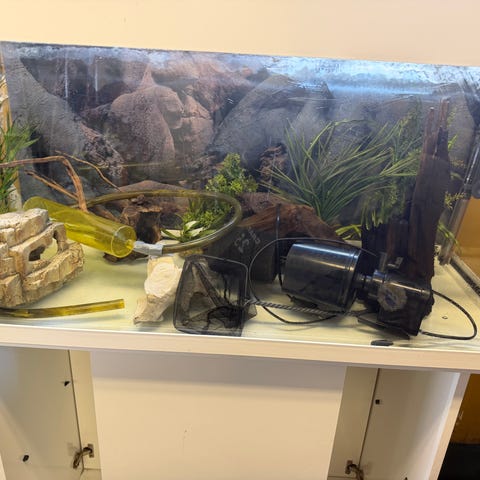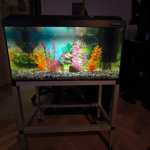 Praktiskt och lättskött akvarium. Överbelysning, doppvärmare sand, stenar och snäckor medföljer. Pumpen är gammal men fungerar - behövs dock en ny om man ska ha många fiskar.