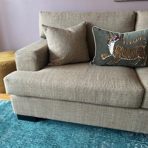 Både klädseln och soffstommen är i bra skick, inga fläckar utan endast lite nopprig på fåtal ställen. Den är ej nedsutten utan har sin ursprungliga form kvar och alla kuddar är enkla att fluffa till om man vill.