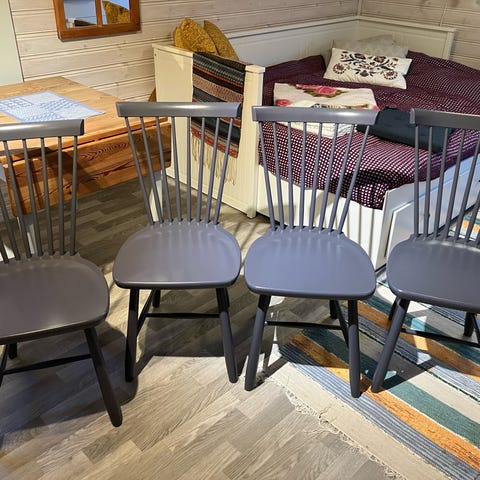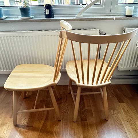 Synligt slitage, framförallt där ryggstödet kommit i kontakt med vårt matbord. Finns även en liten ljusrosa fläck på en av stolarna, troligen från tuschpenna (se bild). I övrigt normalt slitage för en 10 år gammal matstol. Stolarna är stabila och glappar inte. (Jag låter nog mer negativ än jag borde, stolarna är fina men begagnade 😂 )