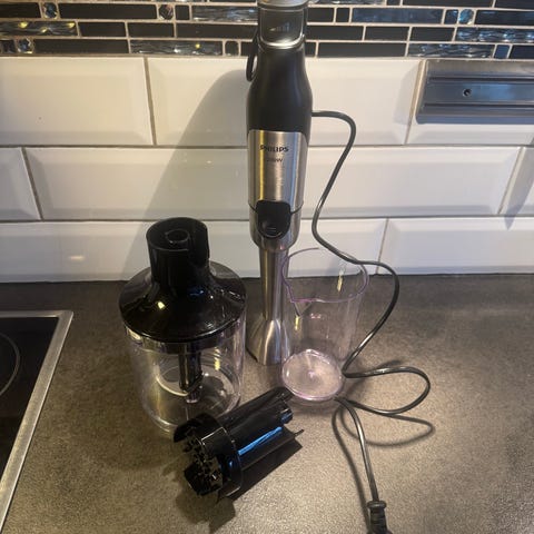 Bamix trådlösa stavmixer med tre olika knivar/blad i rostfritt stål, samt Bamix Processor (minihackare/matberedare) med powder disc/pulverskiva.