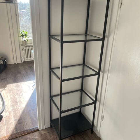 Svart metallhylla med flera hyllplan, inklusive glasytor. Hyllan har dekorativa detaljer i metall och är avsedd för förvaring eller display. Passar för användning i olika rum för att organisera eller visa föremål.