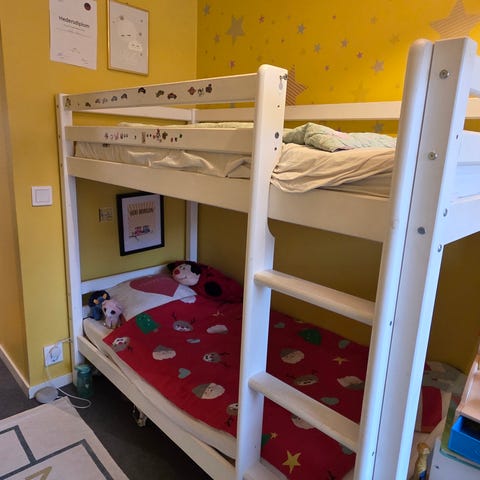 Hoppekids Våningssängar barnmöbel i vit färg. Sängen är designad för barn och är 70x160 cm. Det ingår tre lådor att ha saker i under sängen, två bäddmadrasser från Ikea samt ett helt nytt skruvkit från Hoppekids. Sängen är nedmonterad.