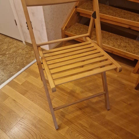 4 st fällbara stolar i trä. Lätta och behändiga. Går enkelt att tex ha dem upphängda då de inte används.