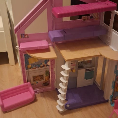 Barbiehus med flera rum och olika möbler inklusive bord, stolar, soffa, köksutrustning och accessoarer. Bebis och bebis-grejer som inte är med på bild kan skickas med också.
