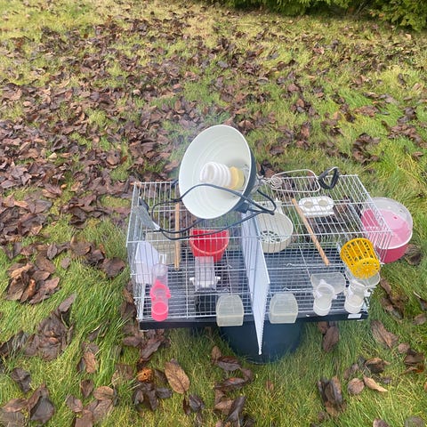 Fyra rektangulära transport-träningsburar, staplade två och två