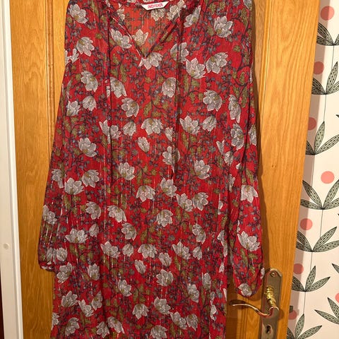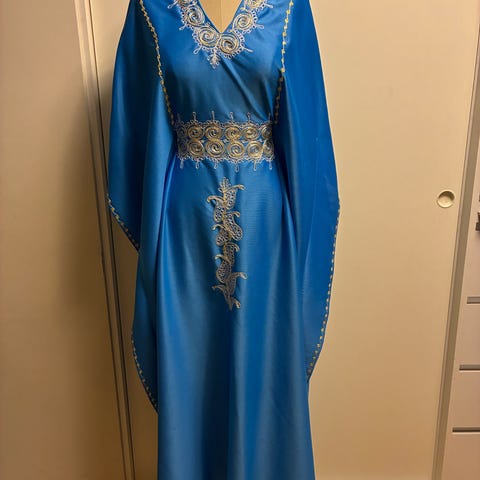 Elegant blue tunic with long sleeves and decorative bead buttons at the front. The tunic has an asymmetrical hem with a fine gold edge.