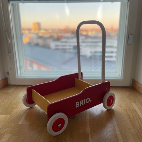 BRIO gåcykel i trä med röda hjul. Lämplig för barn och utformad för att hjälpa till med balans och motorik.