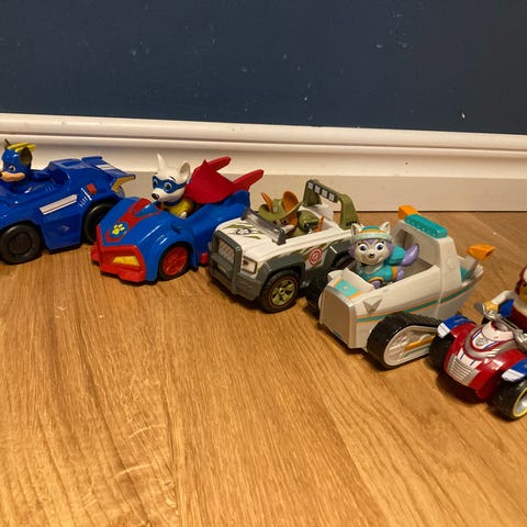 Samling av Paw Patrol leksaksfigurer och fordon inklusive brandbil, helikopter och båt i olika färger.