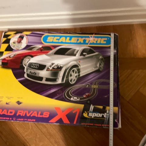 Bilbana med 2 bilar, mekanisk varvräknare, 2 handkontroller och 2 loopar.