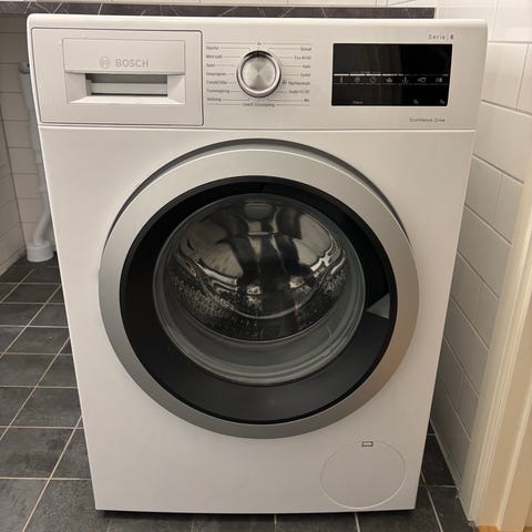Husqvarna frontmatad tvättmaskin. Vit färg med kontrollpanel och vred för inställningar. Maskinen är avsedd för tvätt av kläder och textilier. Kopplas med fast anslutning
