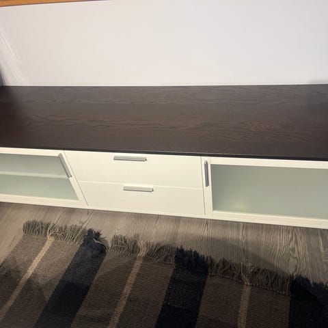Bänken har en praktisk layout med två lådor och två skåp med glasdörrar. Bänken är massiv och i bra kvalitet