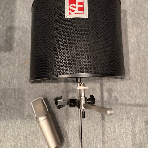 RØDE NT1 kondensatormikrofon med tillhörande shock mount och pop filter. Mikrofonen har en metallkonstruktion och är avsedd för professionell ljudinspelning.