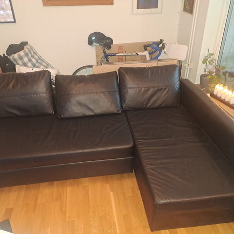 2 bäddsoffa, svart skinn. Väldigt lite använd, stått i gästrum. Nypris 9500 kr. Höjd 73 cm och 94 cm med fasta rygg kuddar.