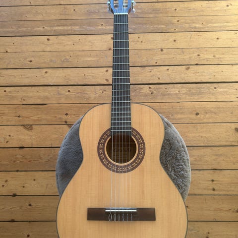 Är i mycket bra skick utan några märken och skador. Gitarrfodral och notställ medföljer.
