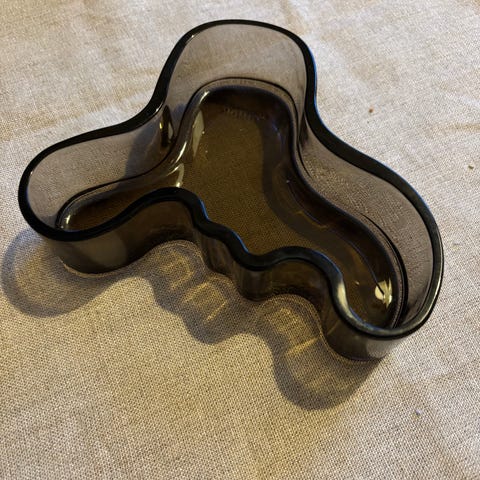 Iittalaskålar i fint skick av märket Savoy i brunt och klarglas färg, 3cm höga och 9cm långa, design Alvar Alto. 200 kr för båda eller 125 kr för en.