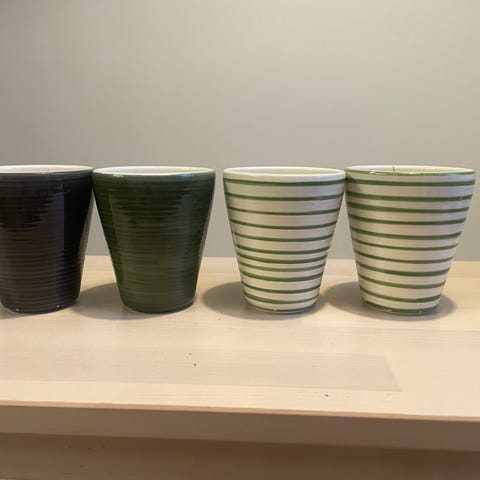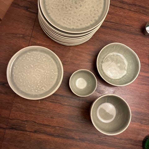 Porslinet är vita med små färgglada detaljer i olika former. Tallrikar använda en gång . Frukostskålar och muggar nya.