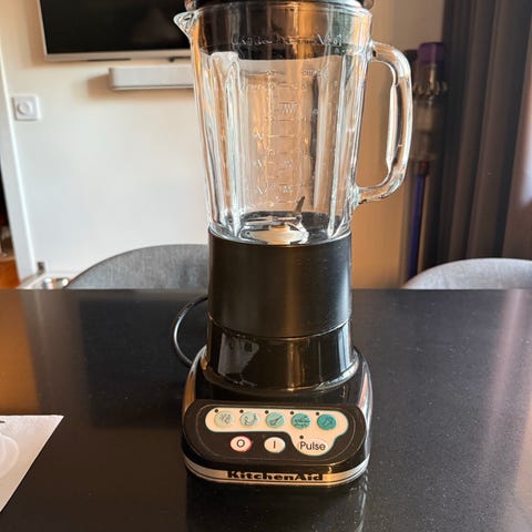 KitchenAid Blender i röd färg med en transparent behållare. Utrustad med flera hastighetsinställningar och en robust design för olika uppgifter i köket.