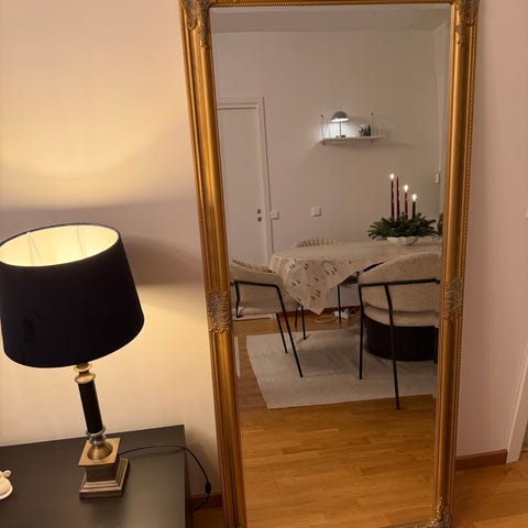 IKEA Helmer golvspegel i vit färg. Spegeln har en höjd på cirka 145 cm och är designad för att stå på golvet med stödben eller hängande. Passar för användning i sovrum eller hall för att kontrollera utseendet.