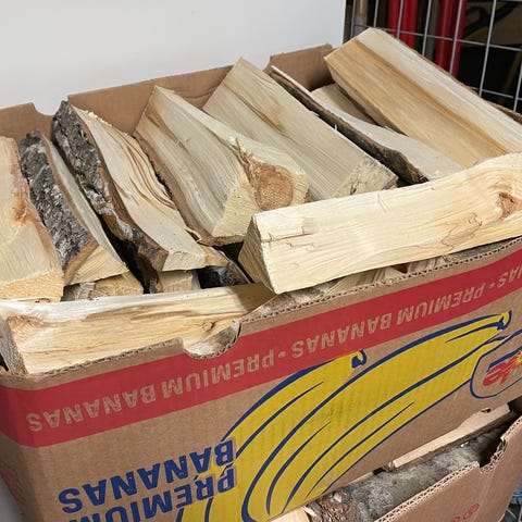 Vedvagn med två hjul och metallram. Vagnen är utformad för att underlätta transport av ved. Den har ett handtag för enkel manövrering. Det går att lasta kluven ved med upp till 40 cm längd