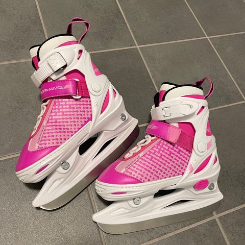 Revolution barnskridskor i storlek 29-32, designade med färgerna vit och rosa. Skridskorna är avsedda för barn och har justerbar storlek från 29 till 33 enligt etiketten. Passar för olika typer av skridskosporter. Halv pris av ny pris på Stadium.