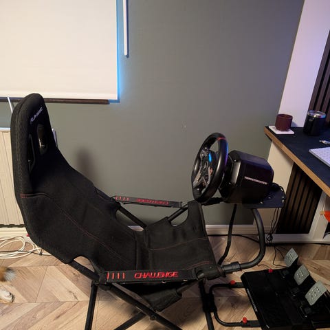Thrustmaster TX Racing Wheel Ferrari 458 Italia Edition racing simulator med ratt, pedaler och justerbar sits. Svart färg, designad för realistisk racingupplevelse med force feedback-teknik. Passar för racingentusiaster som vill ha en autentisk körupplevelse.