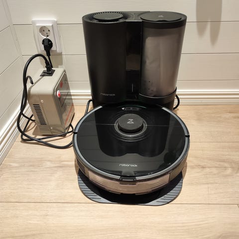 Roborock Q8 max+ robotdammsugare i vit färg. Utrustad med automatisk tömningsstation och mopparfunktion. Designad för att underlätta rengöring av golvytor med både dammsugning och våtmoppning. Inkluderar tillbehör som dammpåse för tömningsstationen.