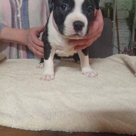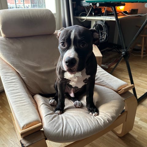 Knut söker ett nytt för evigt hem. Han är Amstaff med en del Dogue de Bordeaux.