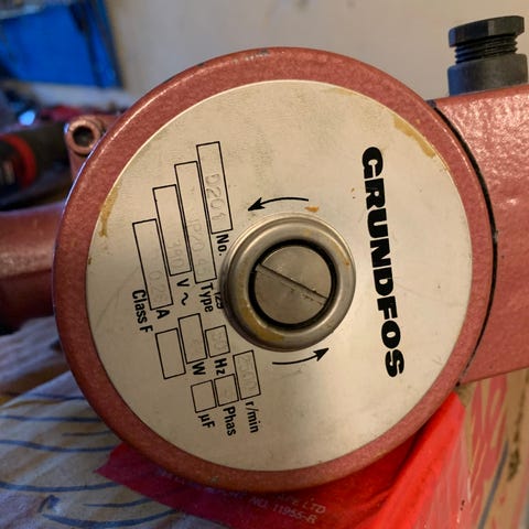 Grundfos UPS 15-60 circulationspump med anslutningar för rörmontering. Pumpen är avsedd för cirkulation av vätska i värmesystem och har en kompakt design.