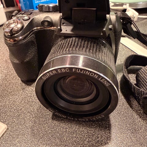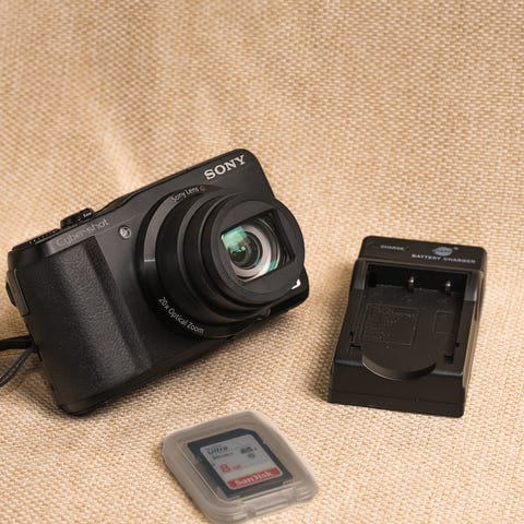 Kameran är fullt fungerande utan skador. Alla tillbehör på bilden ingår.