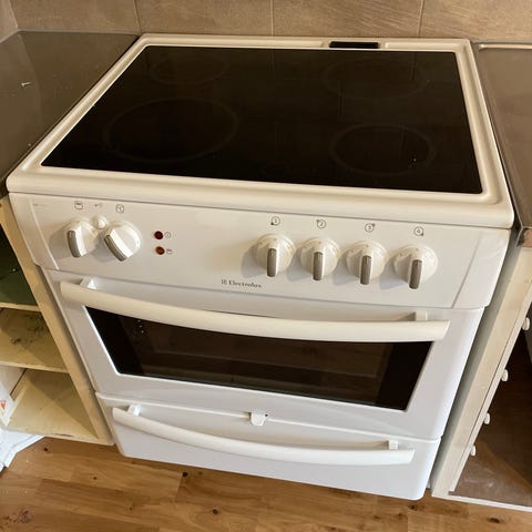 Electrolux glaskeramikspis med spishäll och ugn. Vit färg och standardmått. Passar för allmän matlagning och bakning.