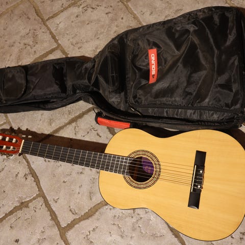 En fin Akustisk gitarr med naturlig träfinish och röd brun baksida. Gitarren levereras med ett svart mjukt fodral med axelrem och handtag för enkel transport.Gitarren ser ut som ny,utan repor eller skador för att den är oanvänd och sparat direkt i väskan. Bekväm att spela på- passar både nybörjare och professionell spelare.