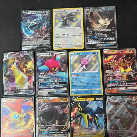 Pokémon samlarkort med olika motiv och karaktärer. Framsida och baksida för alla kort. Min son har flera pärmar med kort som han kollar igenom och eventuellt vill sälja av.
