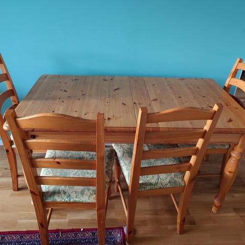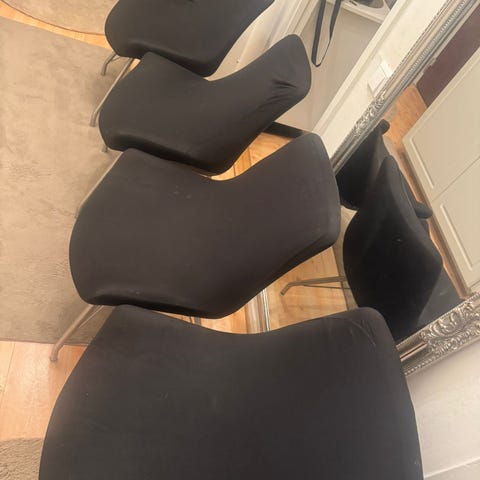 6 stolar med klädda dynor i mörk grått. Bortskänkes pga flytt.