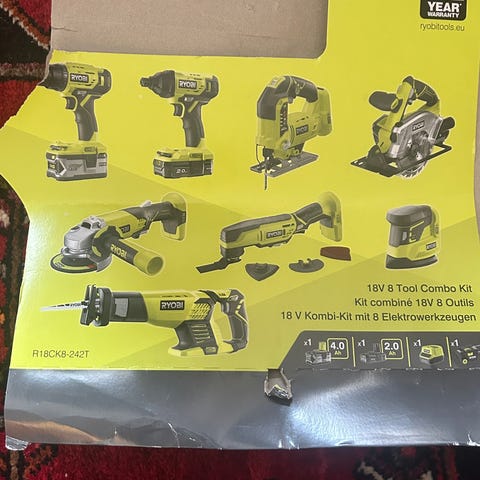 Ryobi One+ 18V kombinationsverktyg set innehållande borrmaskin, sticksåg, kapsåg, och multiverktyg. Setet levereras med batteri, laddare och verktygsväska. Verktygen är batteridrivna och passar för olika typer av bygg- och reparationsarbeten.