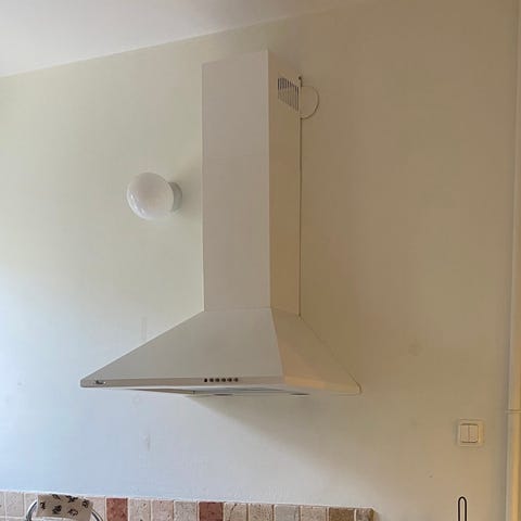 Ikea köksfläkt i rostfritt stål med inbyggd belysning med teleskop täckplåt för ventelationsröret.