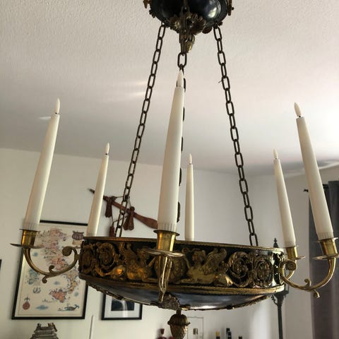 Antik äldre (Malmkrona) tillverkad i mässing med 10 armar för ljuskällor. Med eldragning. Lampan har en dekorativ design med krusiduller och en central rund del. Passar för installation i tak och kan användas som belysning i större rum.