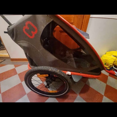 Hamax barnvagn med blått tyg och svart ram. Designad för att transportera två barn med separata säten och säkerhetsbälten. Utrustad med tre hjul, varav två stora bakhjul och ett mindre framhjul, för god stabilitet och manövrerbarhet. Barnvagnen har ett skyddande regnskydd och nätpaneler för ventilation och sikt. Passar för utomhusbruk och aktiviteter som jogging eller promenader.
