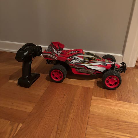 Bilen har mjuka gummidäck med bra grepp för att kunna hoppa över hinder och ta sig fram bra. Bilen är lika rolig att köra med inomhus som utomhus.