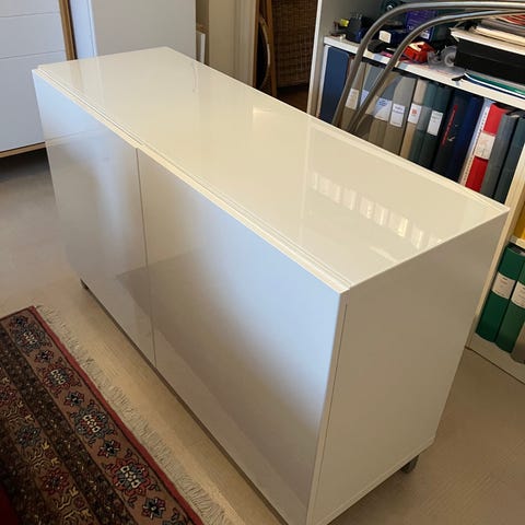 Tre glasdörrar och tre hyllplan.